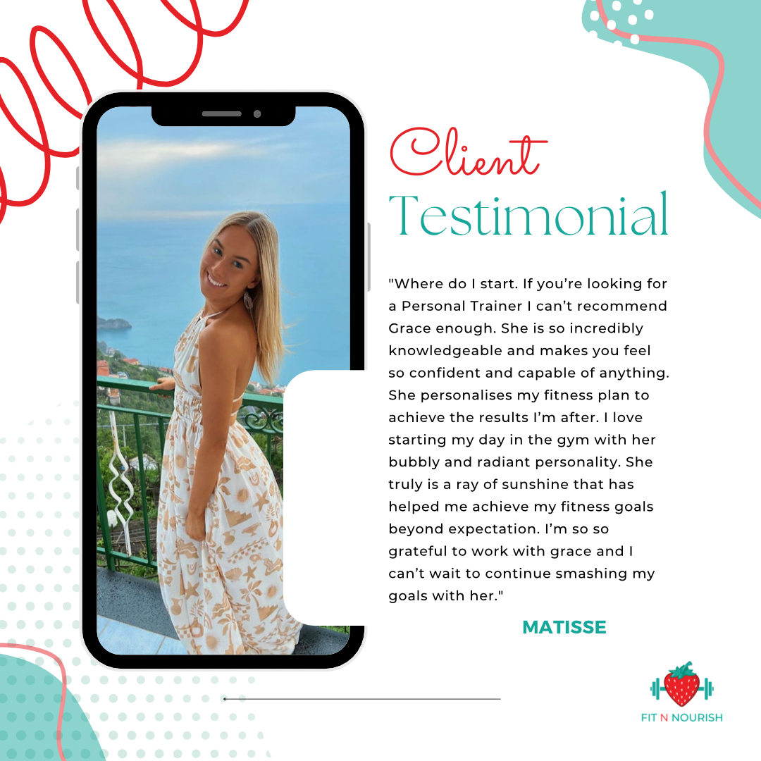 “What an adventure your training sessions have been! At first, I was super hesitant to get a PT because I was at a stage in my life where I couldn't justify the money. But thank goodness, I made the impulsive decision to sign up for your Nutrition meal plan package, which also incorporates two weekly 45mins training sessions! In six weeks, I have noticed massive changes in my strength, endurance & physique! My body has toned incredibly quickly by sticking to your meal plans. These days, I suffer from less decision fatigue on picking the right foods and more energy on getting out of the door & conquering my day. Consistency has been my best friend on this journey. Still, I probably wouldn't have kept myself so disciplined if I hadn't met beautiful little Gracie. Grace goes above & beyond to help support her clients. Grace knows how to help you achieve your goals; be that on supplements to take, dishing out great nutritional advice, or helping you perfect techniques on the gym floor. Her training sessions are like nothing I have experienced before; she gently encourages growth as a trainer by slowly progressing you with heavier weights. She inspires you to believe in yourself, even when you are hurting (in a good way), to complete a few more reps. I love working with Grace every week to get closer to my goals. Overall, Grace's sessions are fun, cost-effective, and rewarding. I only wish I had started sooner.”