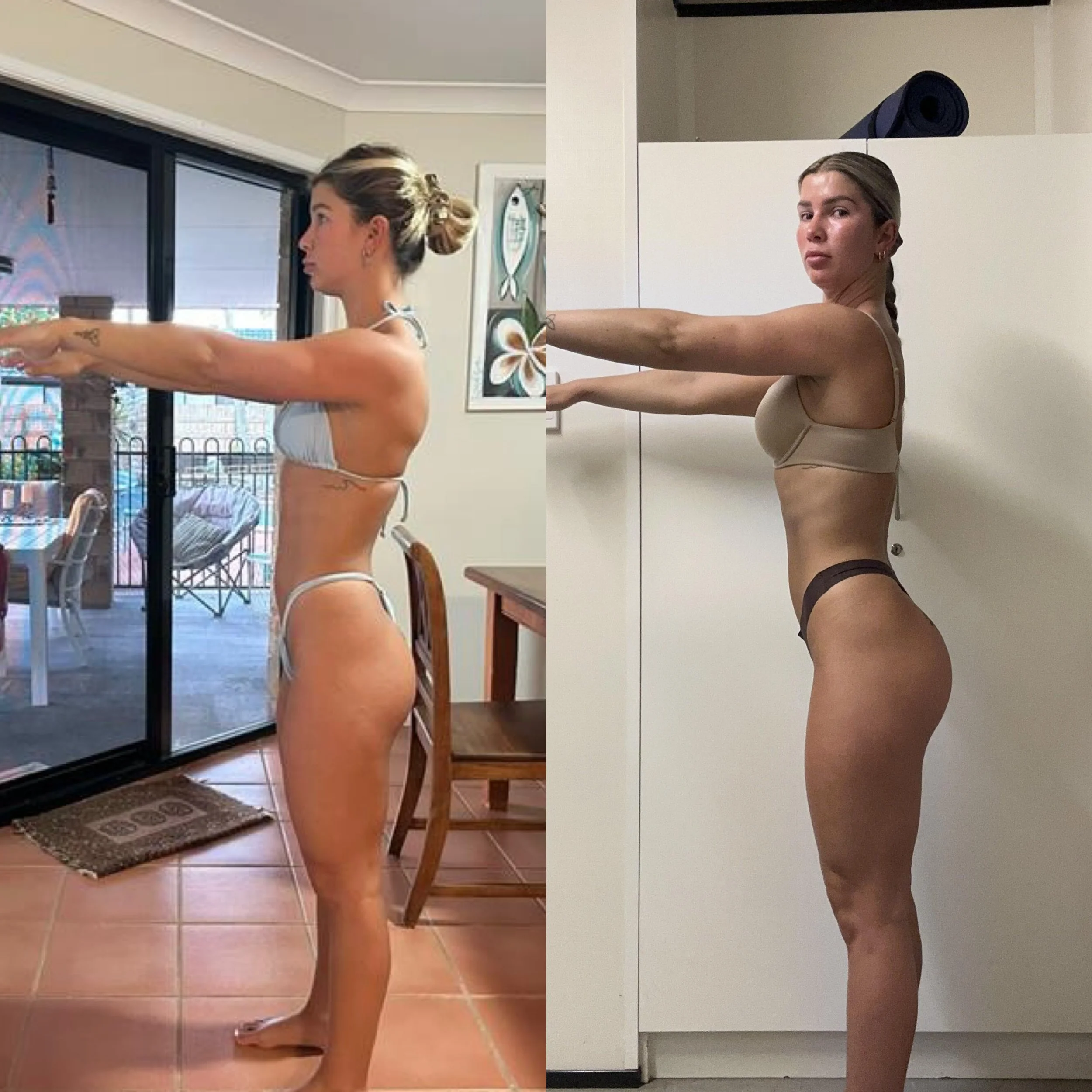 I have been training with Grace since October last year with the goal to improve my body composition & feel stronger. I follow a structured training program that Grace and I tailor based on my check ins/ progress. Not only have I put on 2cm around my glutes, but I am a completely different person between these 2 pics; exercise is SO much more than physical appearance! I have also improved my relationship with food, eating more to effectively build my muscle & strength in the gym. I am so proud of how far I have come & I can’t wait to continue my fitness journey right beside you Grace. Bridge